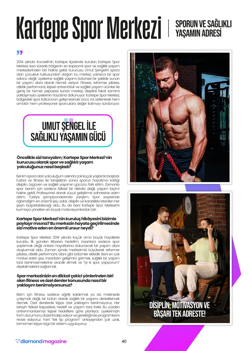 2014 yılında Kocaeli’nin Kartepe ilçesinde kurulan Kartepe Spor Merkezi, kısa sürede bölgenin en kapsamlı spor ve sağlıklı yaşam merkezlerinden biri haline geldi. Kurucusu Umut Şengel’in spora olan çocukluk tutkusundan doğan bu merkez, yalnızca bir spor salonu değil; üyelerine sağlıklı yaşamı bütünsel bir şekilde sunan bir yaşam alanı olarak hizmet veriyor. Fitness, reformer pilates, atletik performans, kişisel antrenörlük ve sağlıklı yaşam ürünleri ile geniş bir hizmet yelpazesi sunan merkez, disiplinli fakat samimi yaklaşımıyla üyelerinin hayatına dokunuyor. Kartepe Spor Merkezi, bölgedeki spor kültürünün gelişmesinde öncü rol üstlenerek hem amatör hem profesyonel sporculara değer katmayı sürdürüyor.